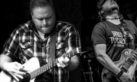 Bandmates from The Lonely Boys smile and pose in front of a brown backdrop.