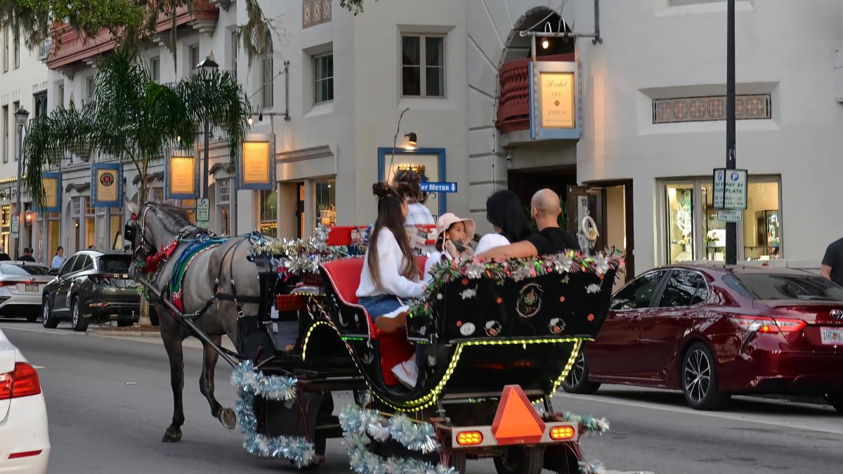 Country Carriages offers rides for one to four people in decorated carriages pulled by horses in holiday finery.