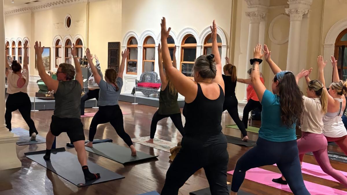 Lightner Museum and Serenity Movement Studio offer Yoga in the Ballroom Gallery on the last Thursdays of January and February, 2026, at 6:00 p.m.