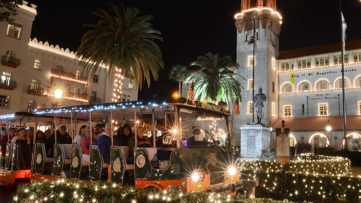 Old Town Trolley's Famous Nights of Lights Tour has become one of the most popular ways to see St. Augustine's Nights of Lights. In 2025 and 2026, the trolley operates nightly from Sunday, November 16, 2025, through Sunday, January 11, 2026. When you take an Old Town Trolley Nights of Lights tour, you sit with family and friends, sing carols, and view the lights through magical glasses. Plus, you are invited to enjoy a sugar cookie and warm cider after the ride.