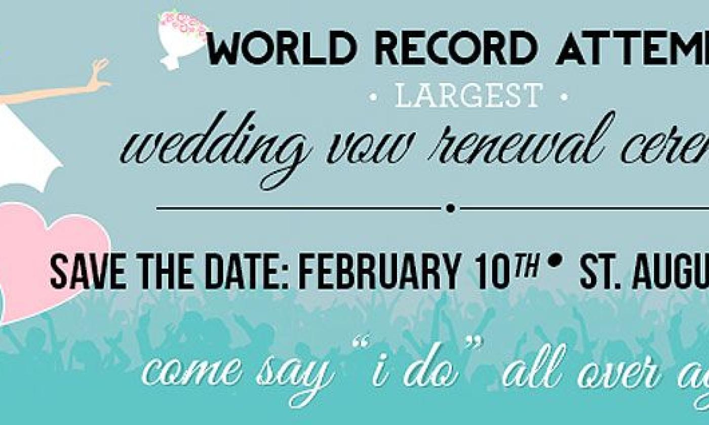 (904) 824-1606Ripleys Believe it or Not! will attempt to set a Guinness World Record for the largest wedding vow renewal ceremony today which will be held in Spanish, English and sign language. Registration begins at Ripleys at 11:00 a.m. and the ceremony will be held at 2:00 p.m. Couples will receive a free carnation, biodegradable confetti to throw after the ceremony, wedding cake, and a complimentary romantic train ride down the bay front following the ceremony. Photographer will be available to take photos of the couples and there is no charge to participate in this event. Each couple needs to bring a photo copy of their original wedding certificate and a photo ID and one lucky couple will win a free honeymoon package. Ripleys Parking lot will be closed for the event, so participants will have to park at the parking garage or nearby lots. E-mail Kim at [email protected] for additional details.