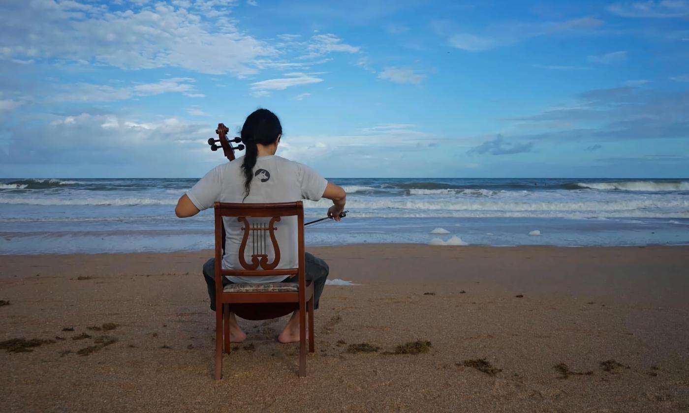 Photographer Lenny Foster took the hero image of Shin playing music to the Atlantic Ocean before he left St. Augustine.