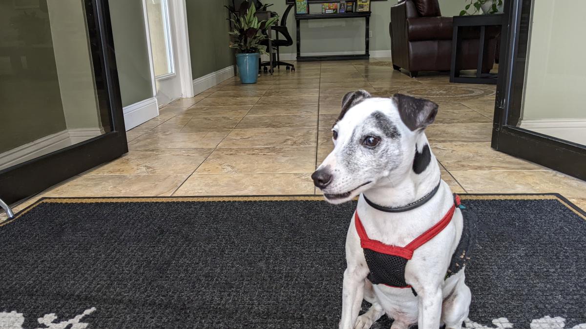 Rossi sitting in the doorway of the pet-friendly Quality Inn Historic Downtown in St. Augustine