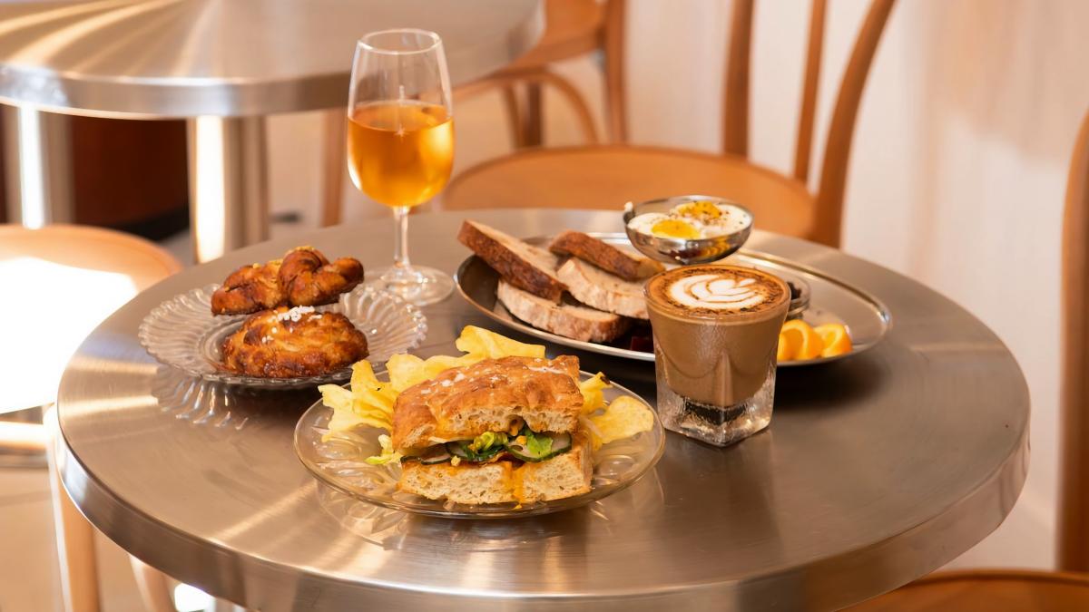 Brunch is available from 8:00 a.m. to 3:00 p.m. with featured options of Pretty Toast (sourdough, ricotta lime whip, jam, and honey), Spanish Tortilla (traditional omelette), Caesar Salad, and the Polenta Bowl (creamy polenta, egg, veggies, cheese, and avocado).