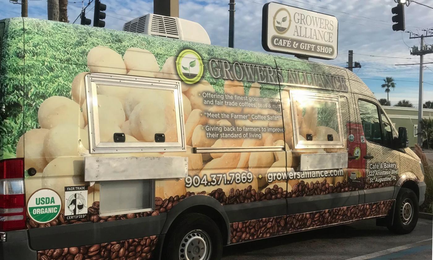 The Growers Alliance food truck offers coffee, tea, pastries, and desserts. The business features unblended coffees from Kenya, Ethiopia, Costa Rica, and Guatemala. Additionally, it also sells craft items and nuts from these same countries.
