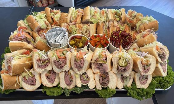 Boar's Head meats and cheeses are used in sandwiches which come with lettuce, tomato, onion, peppers, black olives, and pickles.