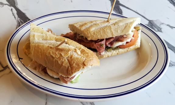 Some savory eats include French-style sandwiches (prosciutto and mozzarella, tuna salad, roast beef and cheese, and chicken salad), empanadas, frittatas, and salads. Soup flavors vary daily.