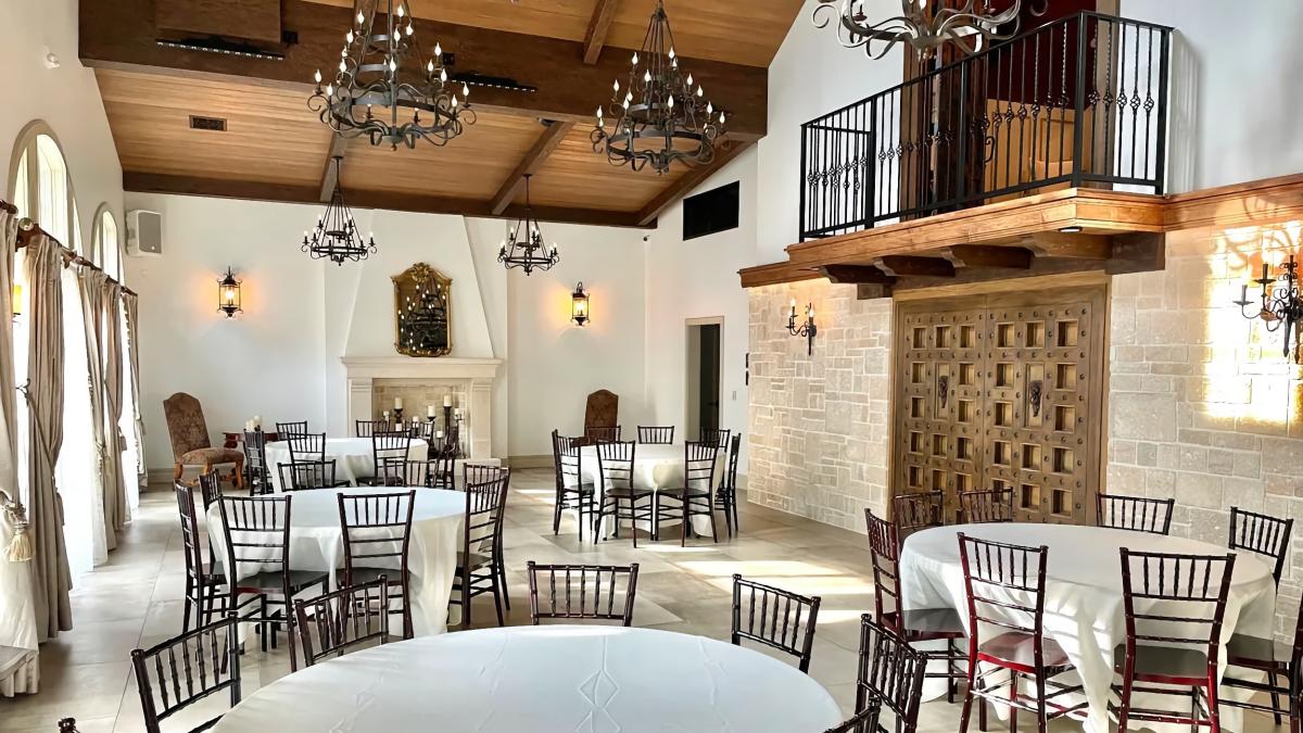 The 2,500 square foot venue includes a private gated patio, a vaulted ballroom ceiling, iron chandeliers, a bridal lounge, a custom lit bar area, a balcony overlooking the ballroom, a catering kitchen, a professional sound system and dance floor as well as guest Wi-Fi.