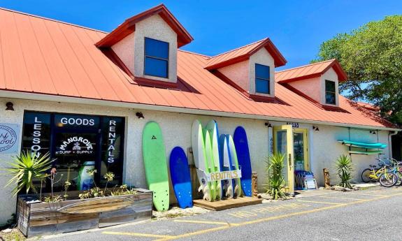 Mangrove Surf Shop, a family-owned and operated business, serves the community's surfing needs at its location on Anastasia Island. They sell surfboards, fins, hats, t-shirts, and stickers. They also rent surfboards, boogies, SUPs, beach chairs, and umbrellas — offering day, multi-day, and weekly rentals upon request.