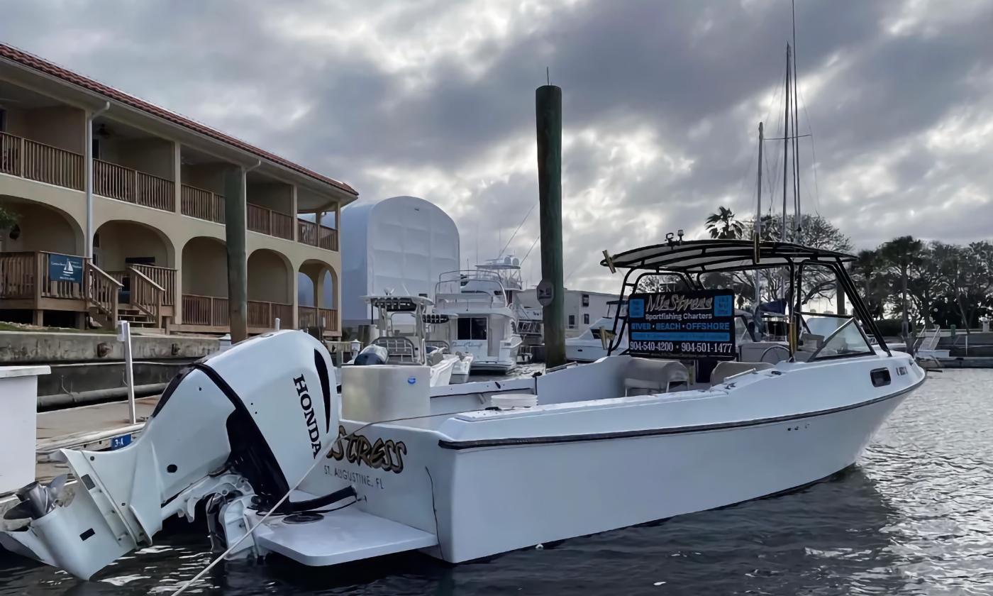 The MisStress boat is a customized 25' Aquasport and features all the safety equipment necessary for up to five passengers. Both inshore and offshore fishing charters are available—four to six hours.