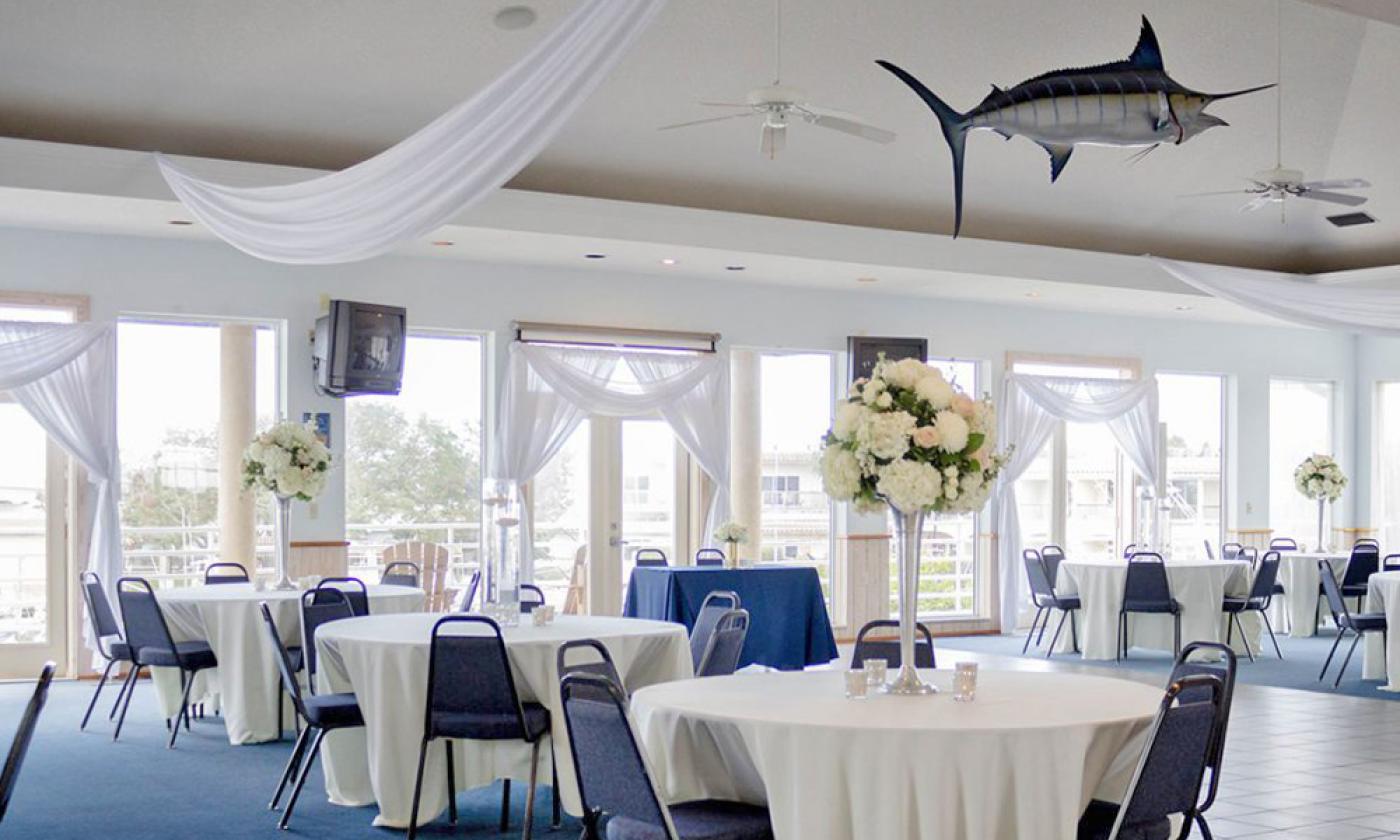 Guests may rent the bottom floor of the Marlin Club for smaller events, such as cocktail receptions or birthday parties. The dockside venue includes a covered pavilion area with picnic tables and a small bar area.