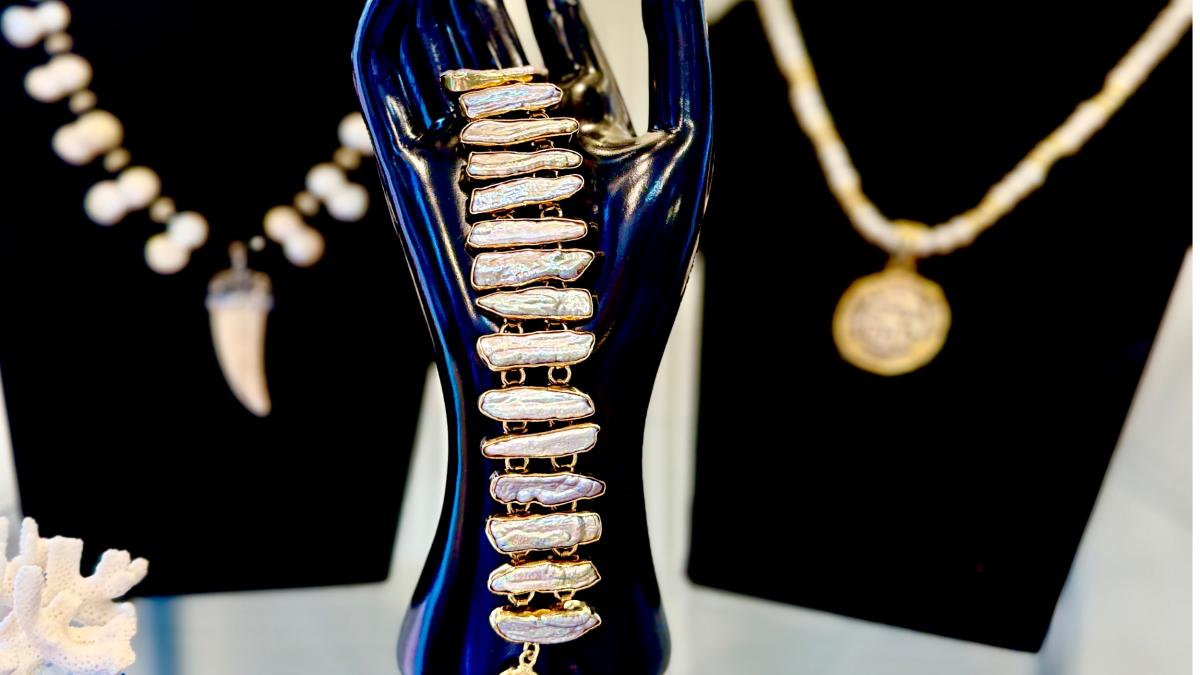 Her jewelry features both traditional and modern pieces; some are created only with pearls, while others include semiprecious stones, polished wood, and crystals. You can purchase one of the hundreds of items in the store or order a custom item.